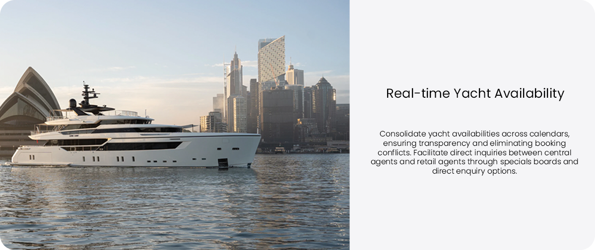 Consolidate yacht availabilities across calendars, ensuring transparency and eliminating booking conflicts. Facilitate direct inquiries between central agents and retail agents through specials boards and direct enquiry options.